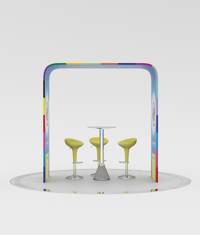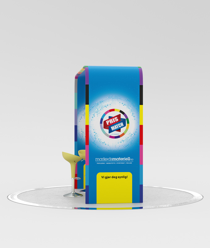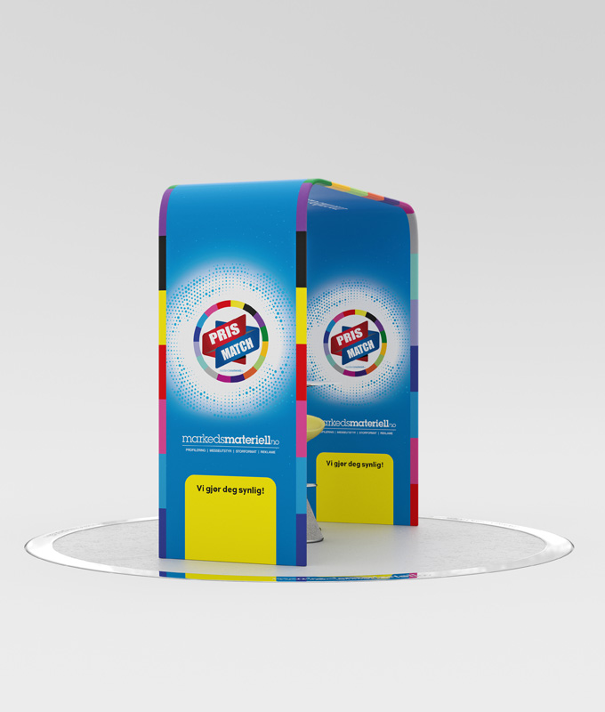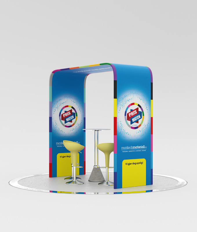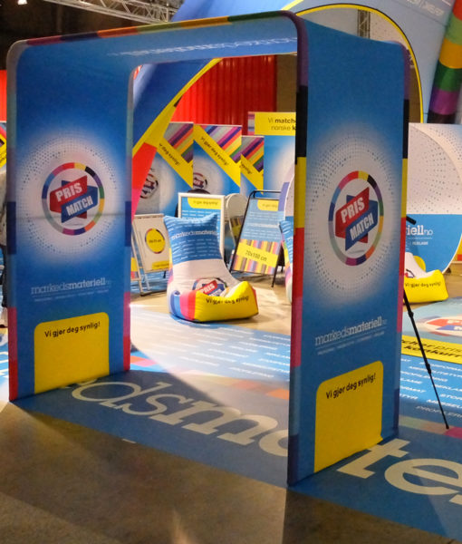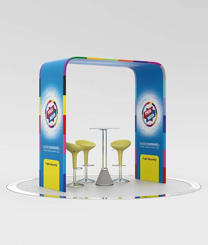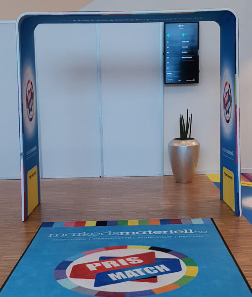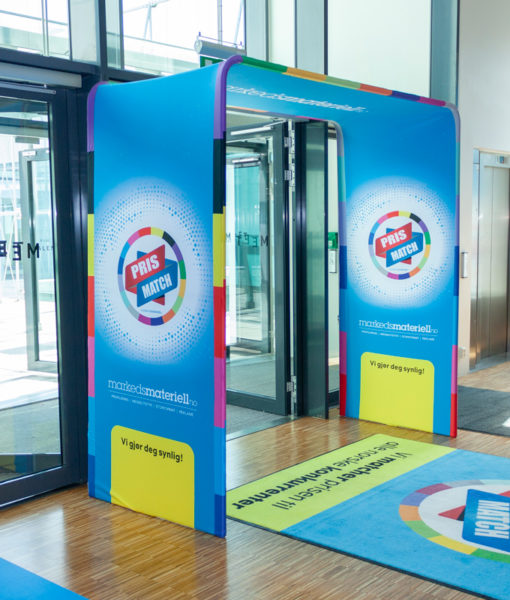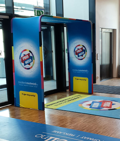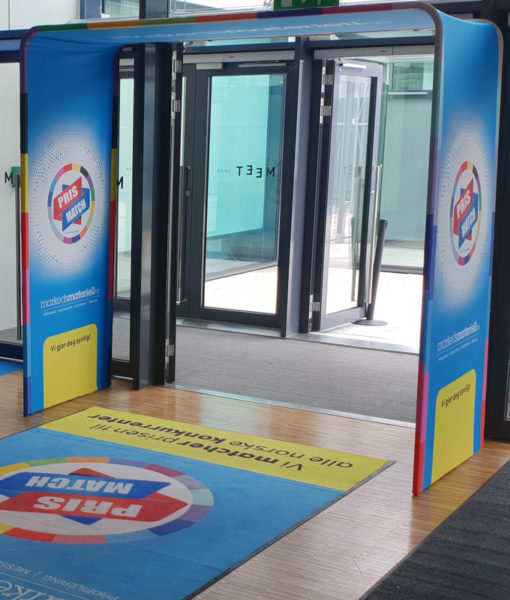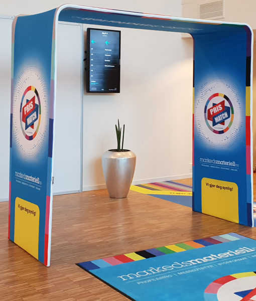 Vår nye Bannerportal Firkantet opptar svært lite av gulvet du har til rådighet, og krever ingen støtte/avgrensning mot omgivelsene. Her oppnår du maksimal utnyttelse av tilgjengelig gulvplass, samtidig som portalen gir deg store trykkflater for budskapet ditt.